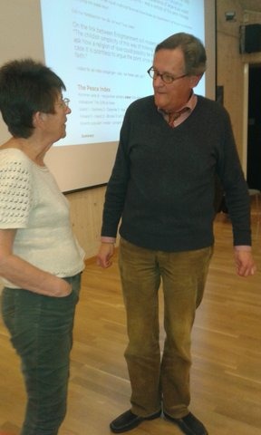 GPI är enormt populärt i media – googlar man "peaceful countries" kommer GPI upp. JÖ: Danmark bombar varje dag i Syrien. Ingen här får höra det. Medierna är tysta. Syrien har invaderats. Är det rättvist att placera den staten längst ner? 23 indikatorer sammanvägs helt ovetenskapligt: kriminalitet, fängelser, vapen i samhället, terrorism, militära utgifter (alla militära utgifter är inte jämförbara), FN peacekeeping, människor på flykt (displaced persons),.... Hur väga ihop olika typer av vapen? Även kärnvapen! Väger allt lika mycket? Hur kan man göra detta och komma fram till något? Vad är det vi får veta? Se upp! Men det skapar åtminstone debatt. Indikatorerna för terrorism och politisk instabilitet var de som hade försämrats mest. Idag 30 000 döda av det som kallas terrorism (statlig terror räknas tydligen inte). År 2000 var det 400. Terrorismen är alltså nu 80 gånger större än innan George W. Bush 2001 startade sitt krig mot den. Slutsats: Världen har blivit mindre fredlig. Den politiska instabiliteten ansågs ha ökat världen över med stora förändringar inom många länder, fördelade över många regioner. Bland dem som hade försämrats mest var Djibouti, Guinea-Bissau, Polen, Burundi, Kazakhstan and Brazilien. De indikatorer som hade förbättrats mest var resurser för FNs fredsbevarande (peacekeeping), något som talar för ökat intresse hos det internationella samfundet. GPI: tar man bort MENA-länderna (Middle East och Nordafrika) har världen enligt detta index blivit fredligare. Men den har också blivit mer ojämlik, så att det är större avstånd mellan de fredligaste och de mindre fredliga. Så här ser det ut: http://www.visionofhumanity.org/#/page/indexes/global-peace-index/ Visionen här uttryckt av skaparen Steve Killelea: http://www.visionofhumanity.org/#/page/our-vision video. Här ges 8 pelare för fredlighet. Dessa är redan uppräknade under "Pillars of Peace". JÖ: Det är en sympatisk vision – men metodologin att slå ihop kvalitativa och kvantitativa indikatorer är utomordentligt tveksamt. Avslutningsvis Hur skulle vi kunna röra oss i fredlig riktning? Det är bra att forska på fred. Gandhi: Det konstruktiva programmet. Studera fredens potential. Men det måste vara något stort fel när i GPI Danmark kommer som nummer 2 (säger JÖ som själv är dansk och väl insatt i politiken). Frågan var, säger Jan Öberg, om freden har ökat eller våldet segrat över tid. Jag har ingen aning. Antropologiska studier visar att fredliga samhällen finns och har funnits. (Fry: Face-to face-samhällen.) Men detta har ingen betydelse för dagens värld. Stater har skapats. Har det därför blivit mer fred? När USA-imperialismen har avtagit (om 15 år gissar JÖ), hur blir det då? Kväkarna är några av dem som lever fredligast. Likaså vissa buddhistiska samhällen. Tvärtom är det med 3 monoteistiska religioners samhällen i Mellanöstern. Om tesen är att det går åt rätt håll, att världen har blivit fredligare (även om det skulle visa sig vara sant), är det risk för att fredsarbetet avtar. En typ av våld som är analyserad är de onödiga sjukdomar som kan påverkas av hygien och medicin (vaccin): Färre människor, i synnerhet barn under 5 år, dör av dessa. Står vi inför ett kallt krig i Europa? USA-imperialismen råder. EU håller på att falla sönder. Vi måste själva finna freden, jobba med ickevåld, lösa problem med ickevåldsliga medel. FN-stadgan är det bästa dokument vi har. De västliga idealen, är de värda att stå upp för? Terroristerna är beredda att dö för det de tror på. Det var också frihetskämparna under de två världskrigen. Idag är det militären som får resurserna, inte de som verkar fredligt. De som vill krig, låt dem själva samla in medlen för krig. Ola F: 1909 sa arbetarrörelsen: "Inte en man, inte ett öre till krigsmakten". JÖ: I Danmark är det många som inte vet att de deltar i krig. Det är viktigt att få upp detta på agendan. Vad göra? Idag finns massor av information, men hur är det med kunskapen? Det behövs överblick. Begrepp och teorier, tolkningar. Gå från information, över kunskap, till kritiskt konstruktivt tänkande och slutligen visdom. JÖ: Studenter och andra har slutat läsa böcker. Läsningar på de här akademiska områdena har blivit väldigt mycket mindre. Se upp! Läs! Förkovra er! Skriv till politiker! Ge konstruktiva idéer, inte bara kritik.