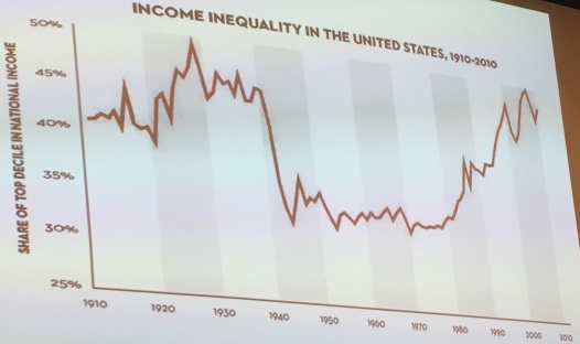 Man kan uppröras av ojämlikhet. USAs ojämlikhetskurva: De 10% rikaste gick från 45% av inkomsterna före 1940 via 35% av inkomsterna till 1980 och därefter åter till 45-50% av inkomsterna. Ett fåtal miljardärer har lika hög inkomst som halva världsbefolkningen.